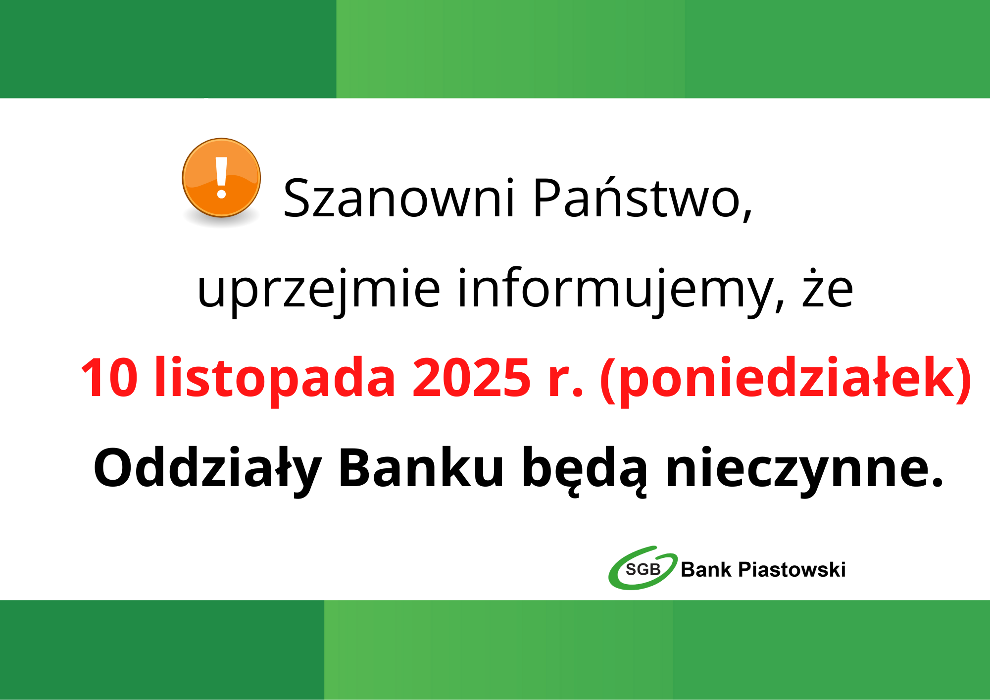 uprzejmie informujemy, że 10 listopada 2025r. (poniedziałek) Oddziały Banku będą nieczynne.
